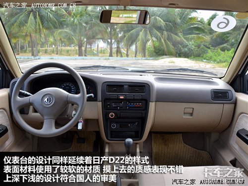 进入车内,发现锐骐ZD30的内饰设计沿用了日产D22的造型,只是方向盘的样式有所不同。仪表台表面采用了较软的材料,摸上去很有质感,而且装配工艺也表现不错。