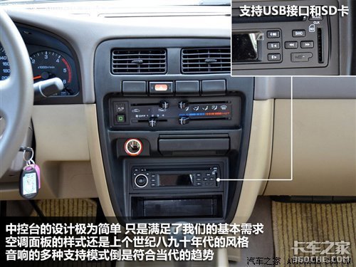 仪表的设计简洁、清晰,中控台上的操作按键已经简单的不能再简单了,除了基本需要的,没有任何多余的设计。空调操作面板还是上个世纪八九十年代的主流设计风格,可以让人很容易看出来它原型车的诞生时期。音响的功能倒是很符合当下的主流,除了支持USB接口,还可以插入SD卡。