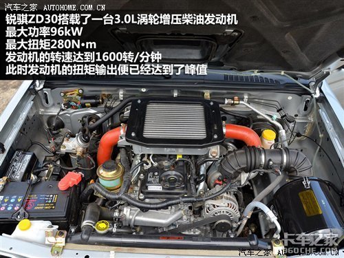锐骐ZD30搭载的是一台排量3.0L涡轮增压柴油发动机,最大功率96kW,最大扭矩达到了280N·m,并且发动机从1600转/分开始就已经达到了扭矩输出的峰值,保证了车辆的动力性。与其搭配的是一台5速手动变速箱,挡位比较清晰,只是在行驶中,发动机传递过来的震动较为明显。对于经常驾驶汽油发动机的我来说,实在有点不太适应,当然,柴油发动机的震动是无法避免的,这也是它的特性之一。所有厂家也在通过不同的技术尽量减小震动的情况,不多对于这个价位来说,它的表现还是正常的。