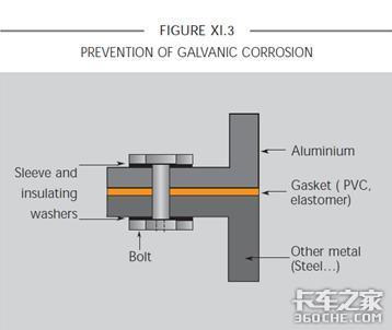 电解质使2金属间的电子流动。如果金属(水包含盐)潮湿出现在电子或电解质那么这可以发生。商用车,这种类型的腐蚀发生,钢或铝制部件是被螺栓栓的,铆接或宁在一起了。雨水或道路溅的水会与金属部件接触。(图XI.2)