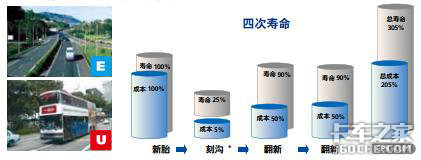 轮胎翻新是对胎面剩余花纹2mm左右的轮胎进行翻新的服务。将轮胎胎体进行翻新是节省轮胎使用成本的最有效的方法,米其林翻新胎的各种技术指标与新胎几乎一样。翻新采用与米其林新胎一样的胎面胶,确保翻新轮胎有如新胎一样的寿命;提高轮胎使用寿命,减低车辆运营成本。