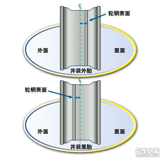 所需的最小外偏距取决于双胎配置时两条轮胎之间必须留出的距离。外偏距是轮辋的中心线到轮盘安装面之间的横向距离。外偏距将轮辋中心线放置在安装面的外侧。
