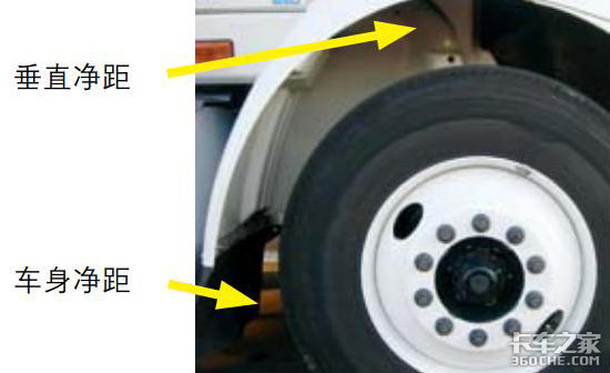 垂直净距是测量胎面顶部到轮胎上方的车辆部件(通常是挡泥板)之间的距离。当弹簧工作时,这个距离将发生变化。整个车轴与车辆底盘之间相对的垂直运动会受到车轴止动板(axlestop)的限制。当测量垂直净距时,请将止动板的净距从总净距中减去,得出的数值就是剩余的垂直净距。