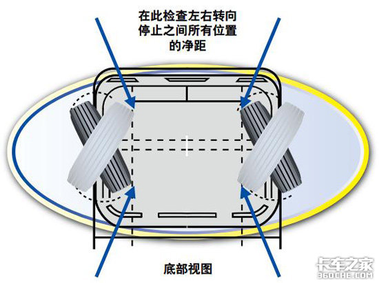 两个前轮的净距必须在转向锁定位置测量。由于最小净距可能出现在某个中间点上,所以必须在将车轮向左或者向右全部打满时测量前轮净距。还应该测量转向限位器,因为它们控制着转向的角度。请确保转向限位器安装完好,没有损坏,否则将可能导致净距问题或者异常的轮胎磨损。
