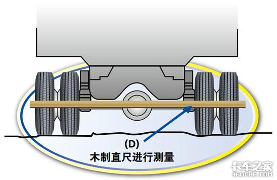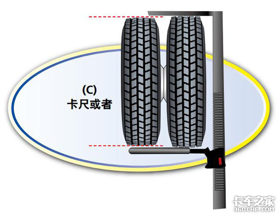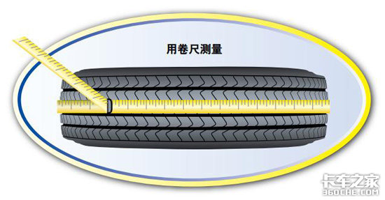 用这种方法测量考虑到了任何不规则磨损的情况。双胎安装时的两条轮胎的胎面深度之差应该不超过4毫米,直径之差不超过8毫米,圆周总长之差不超过25毫米。安装在驱动轴两端的轮胎也应该满足这些允许差值的要求。
