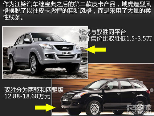 作为江铃汽车继宝典之后的第二款皮卡产品,造型风格风格摆脱了以往皮卡彪悍的粗犷风格,而是采用了大量的柔性线条,一看它,自然会想起“驭”字辈大哥驭胜。网通社编者与江铃内部人士沟通得知:两车出自一个平台,域虎预计售价11万元起售总计将有6款车型推出。