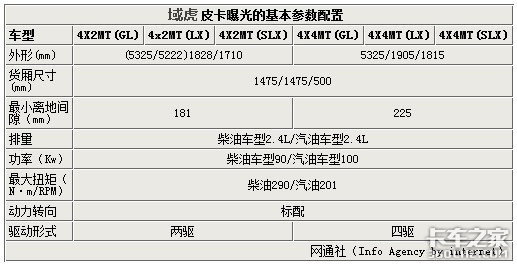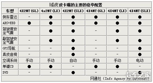 虽为皮卡,但域虎皮卡 丰富性配置一点也没有少,诸如ABS+EBD、铝合金轮毂、电动车窗都将成为标准配置,DVD、GPS及自动空调也将在最高配车型上得以体现。