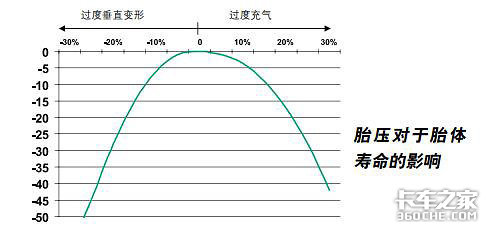 来卡车之家App【卡车之家 原创】轮胎保养中最关键的因素就是正确的充气。轮胎或者内胎都不可能做到完全密封。为了避免充气不足所带来的危险,轮胎中漏掉的空气必须补足。另外, 相差20%的气压会带来超过20%的里程损失,确定适合车辆状况的标准气压值很重要。如下图所示,充气压力对于轮胎的性能(包括胎面寿命和耐久性)有直接影响: