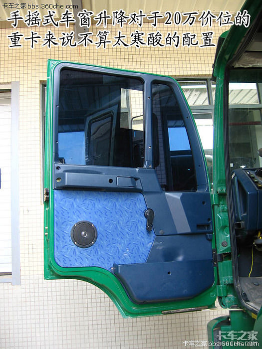车门上有一个杯架和两个储物格,其中较大的那个可以用来放折叠伞,较小的也可以放一些零碎物品。车窗升降还是手摇式的,对于20万价位的重卡来说,这样的配置还是可以接受的。