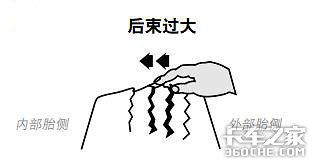 前束过大会导致由外到内轮胎摩擦加大,后束过大则会导致由内到外轮胎摩擦加大。前束总和是两个车轮平面水平线组成的角度。前束过大是水平线在车轮前方相交,或者说车轮前方的距离小于后方的距离。