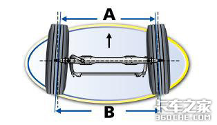 在两条转向轴轮胎上标记一个参考线。测量左右轮胎参考线之间在轮毂中线高度的距离。首先测量轮胎后部(途中字母B所指示位置)。