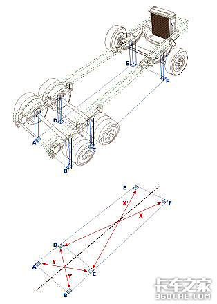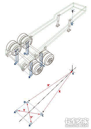 挂车:如果AD=BC、CE=DE,车轴即为平行、对称。车轴端间距离和挂车牵引销到首根轴端间的距离超过3毫米的偏差就表示定位不准。
