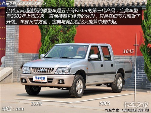 江铃汽车是国内生产皮卡的一个老牌企业,其生产皮卡可以追溯到1993年,当时主要是进口五十铃皮卡的散件进行组装,随后逐步将配件国产化,并完善产品,在2002年推出了江铃宝典,在此后的十年间宝典成为了江铃汽车的主打产品。