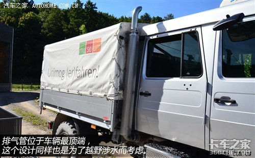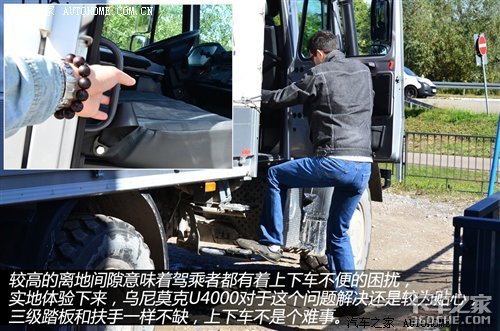 车身侧面的Blue EC5金属标志代表它符合欧5排放标准的车型,但欧洲以外的市场仍可选择欧III标准的发动机。较高的离地间隙意味着驾乘者都有着上下车不便的困扰,实地体验下来,乌尼莫克U4000对于这个问题解决还是较为贴心,三级踏板和扶手一样不缺,排气管位于车辆最顶端,这个设计同样也是为了越野涉水而考虑。