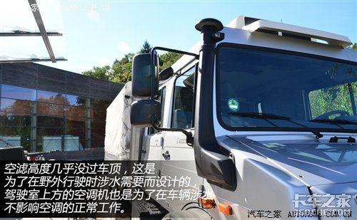 空滤高度几乎没过车顶,这是为了在野外行驶时涉水需要而设计的。当车辆行驶在水中或泥泞路况时,标准版本的乌尼莫克U4000可提供0.8米的涉水深度,通过选装,涉水深度可达到1.2米。发动机盖上黑色的部分是出水口,如果发动机舱进水,通过气压就能将发动机舱内部的水全部排出,可惜没有体验到这个环节。另外,驾驶室上方的空调机也是为了在车辆涉水不影响空调的正常工作。