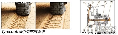 米其林公司为其打造的越野专用轮胎体积庞大,轮胎的尺寸达到365/80 R20。这款轮胎带有Tyrecontrol中央充气系统,可自动放气,行驶在沙漠等松软的路面上时需要降低胎压增加轮胎接触地面的面积,这个功能在此时就能起到相当大的作用。