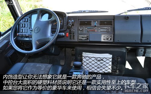 曾经有位德国工程师这样说,乌尼莫克有两种状态,一种叫“down time”,意为静止状态,它不会给你豪华享受;而另一种叫“up time”,意为动起来状态,因为当坐进驾驶室后就会对它有了深刻的认识。乌尼莫克的内饰造型让你无法想象它就是一款奔驰的产品,除了4辐方向盘上硕大的奔驰标识外,一切设备看上去都相当“古老”。中控台大面积的硬塑料材质说明它还是一款实用性至上的车型,如果您将它作为等价的豪华车来使用,相信会失望不少。