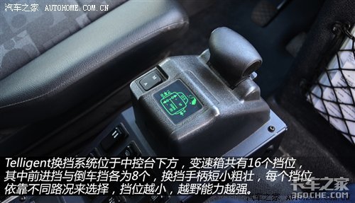 Telligent换挡系统位于中控台下方,与Actros的操作相同。8速变速箱共有16个挡位,其中前进挡与倒车挡各为8个,换挡手柄短小粗壮。变速箱的速比范围极广,每个挡位下依靠路况来选择,挡位越小,越野能力越强。