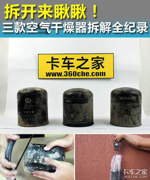 我们拿到的三个旧干燥器品牌分别为皇瑞、瑞立、WABCO,都是在车辆上使用一段时间后更换下来的,已经失去了使用的价值。