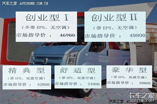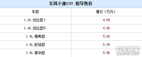 2012年9月21日,东风小康C37在青海湖举办了它的新车上市仪式,此次共推出了两个排量的五款车型,售价为4.69-5.98万元。具体售价请看以下图表: