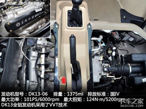 动力方面:东风小康C37搭载的是一台1.4L全铝发动机,型号DK13-06,最大功率为101马力/6000rpm,最大扭矩为124N·m/5200rpm,传动方面使用的是5挡手动变速箱。这台发动机采用了可变气门正时系统,全面满足发动机在不同转速情况下的进气需求。