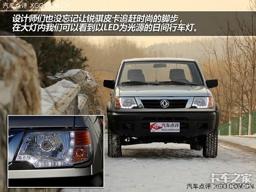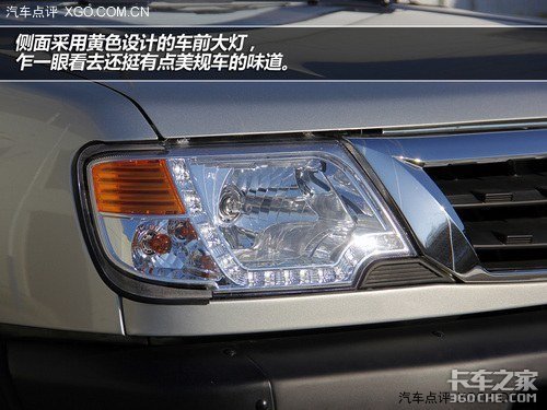 虽然国内设计的皮卡总给人感觉不够时尚,不过车辆本身的实用性却足以让许多选择它们的消费者忘记其他小的不满。侧面采用黄色设计的车前大灯,乍一眼看去还挺有点美规车的味道。另外就是设计师们也没忘记让锐骐皮卡追赶时尚的脚步,在大灯内我们可以看到以LED为光源的日间行车灯,这样不仅增强了锐骐皮卡前脸的吸引力,同时还提升了日常行车时的安全性。