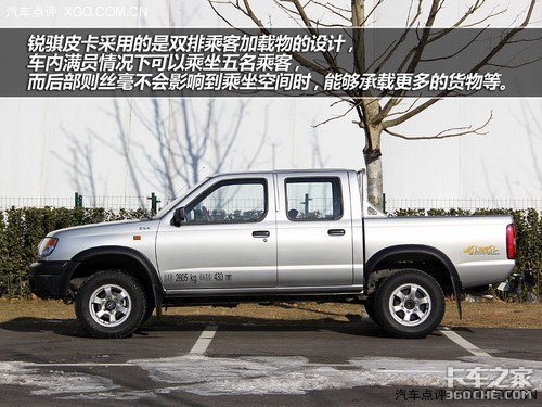 从侧面看去,可以了解到锐骐皮卡采用的是双排乘客加载物的设计,车内满员情况下可以乘坐五名乘客,而后部则在丝毫不会影响到乘坐空间时,能够承载更多的货物等。由于皮卡也采用较高的离地间隙,所以车的下半部分单看时颇有点越野的意思。(要在这里强调的是,在遇到前方路面有积水时,请一定小心,无论车辆离地间隙距离多高,也终究还是车不是船。)