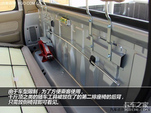 另外还需要说一下,锐骐皮卡由于车型限制,为了方便乘客使用。千斤顶之类的随车工具被放在了的第二排座椅的后背,只需放倒椅背即可看见。