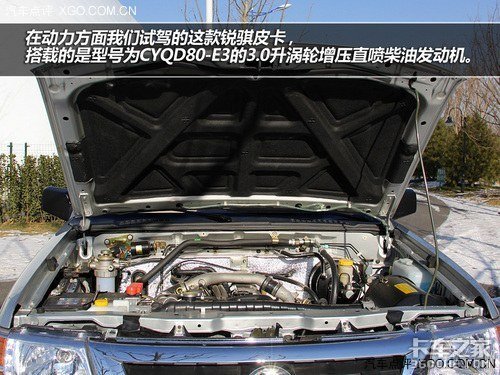 在动力方面我们试驾的这款锐骐皮卡,搭载的是型号为CYQD80-E3的3.0升涡轮增压直喷柴油发动机。最大功率80.9千瓦/3600转,最大扭矩为221牛米/2200-2600转。与发动机匹配的是一台五速手动变速箱。