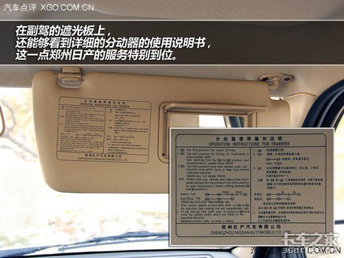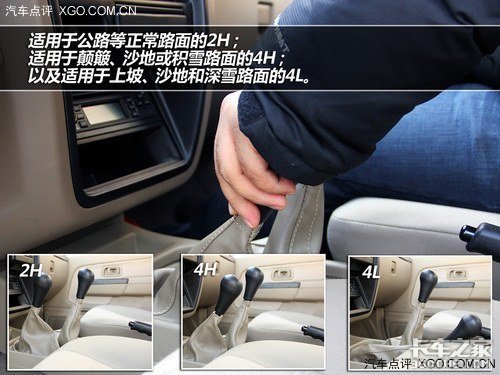 试驾的这款锐骐皮卡为四驱版车型,在挡把边上可以看到分动器的控制杆,有三种驾驶模式可选择。适用于公路等正常路面的2H;适用于颠簸、沙地或积雪路面的4H;以及适用于上坡、沙地和深雪路面的4L。同时在副驾的遮光板上,还能够看到详细的分动器的使用说明书,这一点郑州日产的服务特别到位。