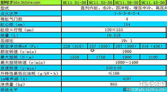 MC11.43-30(40),M-德国MAN公司,C-CNHTC中国重汽,11-排量11升,43-430马力,3-国三排放(4-国四排放),0-四气门。以此类推,大家看看MC05.18-30、MC07.34-30、MC13.54-30都代表什么含义。目前量产的是MC07、MC11,另两种产品陆续也会上市。