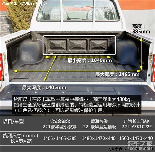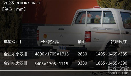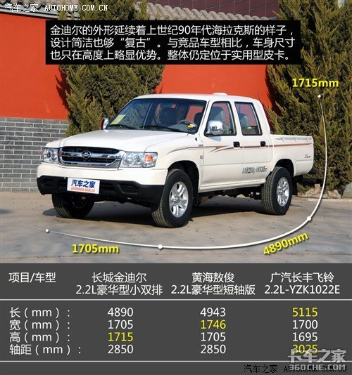 目前,金迪尔车型分别搭载2.2L汽油和2.8T柴油两种排量的发动机,共7款车型在售。其中,2.8T柴油版还有两种型号发动机“GW2.8TC-2”和“GW2.8TDI-2”,两者在数据上有些许差别,前者最大功率95马力(70kW)和峰值扭矩225N·m,后者两项数据分别为98马力(72kW)和220N·m。当然,做为皮卡车型,金迪尔根据车身尺寸的不同,还有大双排和小双排的区别。