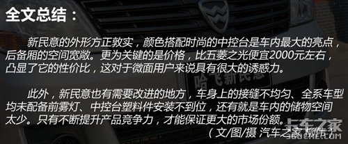 目前,哈飞新民意共有5款车型在售,搭载的都是1.0L汽油发动机,只是调校不同,分别为48马力和60马力。今天介绍的是使用高功率发动机的新民意1.0L基本型DA465QA(以下简称新民意),该车在石家庄地区的售价为2.79万元(因地区差异,各地报价可能存在差异),在全车系中处于中等档次。新民意外形方正敦实,轿车化的中控台采用了时尚的颜色搭配,后备厢空间比较宽敞,主要走的是实用路线。下面就看看它的具体表现。