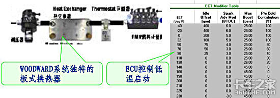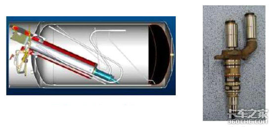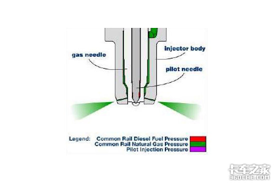 LNG经过汽化压缩后,压力达到300bar,供给燃气轨.ECU控制专用喷射阀先喷射少量柴油起引燃作用,然后再喷射CNG,燃烧作功。