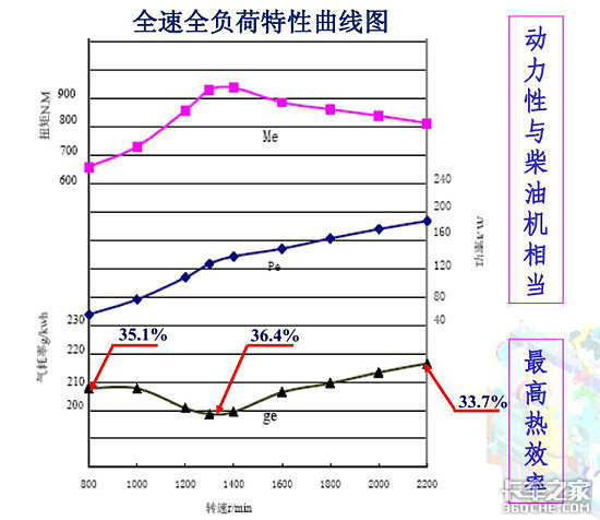 根据“全速全负荷特性曲线图”,CNG发动机的动力性与柴油机相当,但经济性高于柴油发动机。