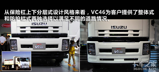 VC46的前脸及整体造型依然沿袭了五十铃成熟产品的家族风格,同时大量运用了部件模块化设计。不仅有效控制了产品开发成本,还有利于提高零部件的通用性,降低用户的使用维修成本。高大的保险杠为庆铃公司全新开发,从保险杠上下分层式设计风格来看,VC46为客户提供了整体式和防护栏式两种选择以满足不同的道路情况。