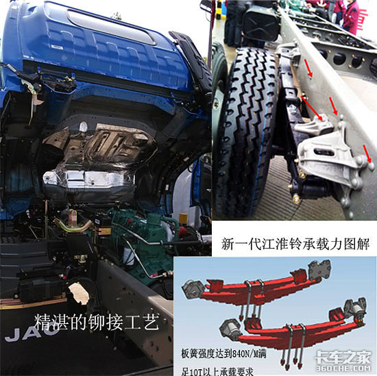 在营运价值方面,新一代江淮铃针对不同地区的道路路况,在标配8.25R16轮胎的基础上,全新增加9.00R20大钢丝胎作为备选,提供更强的抓地力和承载力;同级别车型中最大断截面一次冲压成型大梁,匹配加强板簧,每片加厚1mm,使其刚度达到惊人的840N/M范围,全面超越同级产品,满足10T承载需求毫不费力;