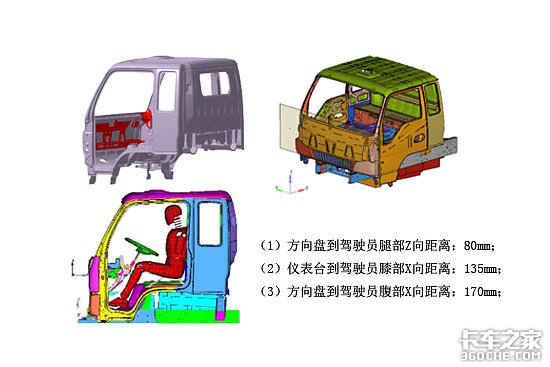在整体安全构架上,车身前围采用高强度防撞梁,形成保障人身安全的第一道防线,有效防止驾驶室开裂问题发生;防撞梁与A柱、侧围、地板纵梁连接,碰撞时能有效分散撞击能量,使前围变形最小,构成第二道保护防线,保证驾驶室内生存空间;二度可溃缩式空腔吸能区能最大程度吸收撞击势能,构成第三道防线。细节处,仪表台在轻卡领域率先采用管梁式结构,有效防止线束损伤,消除安全隐患。