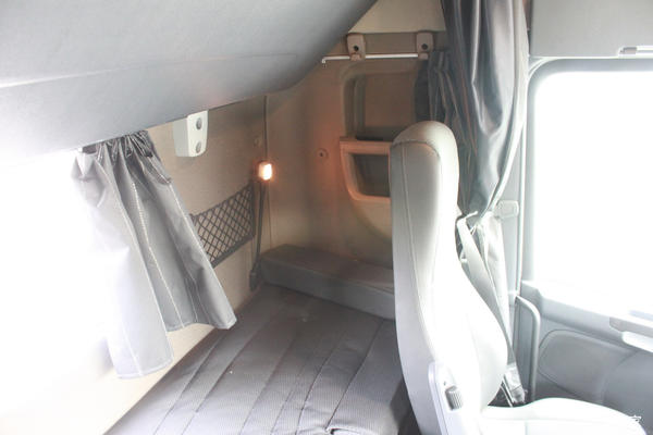 驾驶员一侧后卧铺,带有照明灯和储物网兜,而且卧铺前拉帘也固定在驾驶员座椅侧面。
