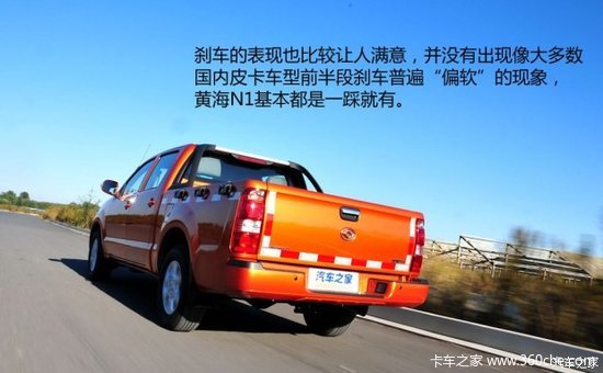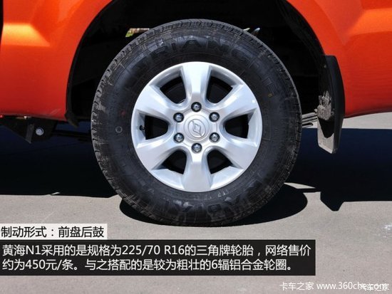 黄海N1的悬架结构为前双叉臂式;后整体桥式,弹性元件采用5片钢板。钢板弹簧的承载能力较强,不过舒适性欠佳。车辆在中低速通过一些烂路或减速带的时候,后排乘客所间接受到的颠簸和跳跃感较为明显。