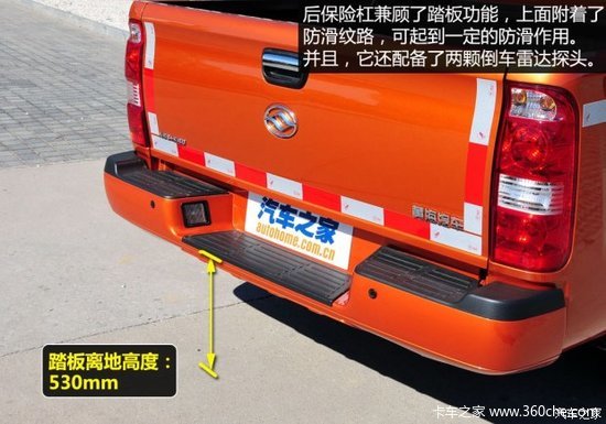 车尾的造型虽然中规中矩,不过高位刹车灯、货架及其锚点的配备都非常到位,尤其是后保险杠上的两颗倒车雷达探头,这对于车身较大的皮卡车型来说,是非常实用的。它的货厢尺寸为1615x1520x465(mm),在国内皮卡车型中算是中等尺寸的货厢。
