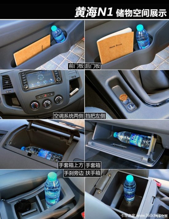 在储物空间方面,黄海N1的表现是比较不错的,前后门板及中控台附近的储物空间共计10处,且它们的实用性都表现较好。