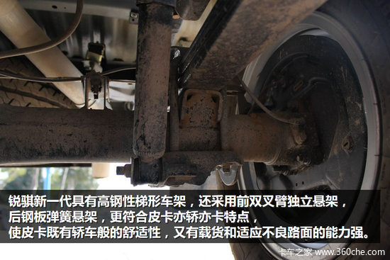 锐骐新一代具有高钢性梯形车架,还采用前双叉臂独立悬架,后钢板弹簧悬架,更符合皮卡亦轿亦卡特点,使皮卡既有轿车般的舒适性,且比轿车的载货和适应不良路面的能力强。