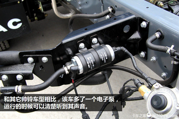 和此前小编所拍摄的帅铃轻卡不同的是,该车除了采用串联式双级燃油滤芯外,在两个燃油滤芯中间还串联了一个电动燃油泵。这个配置在其他车型上并没有看到,不过其管路和线路布置的让人看着比较纠结。