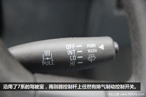 在转向柱的左侧依然是灯光控制系统,右侧是雨刮器控制。可是,那个排气制动开关是怎么回事呢,难道电动机还带有排气制动?后来想想,这台纯电动轻卡沿用7系驾驶室的,为保证了配件的通用性,也就明白了为何还保留着排气制动开关。