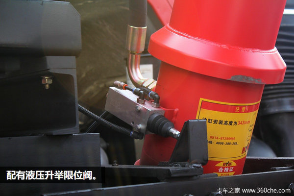上装的升举装置采用的是行业领先的海沃液压油缸,升举速度更快,自重更轻。同时还配有升举限位阀,一旦升举到一定程度,阀门自动断开供气,不再继续升举。当然,升举报警器是必不可少的装备,有了这个装置,再也不用担心会忘记降下车厢了。