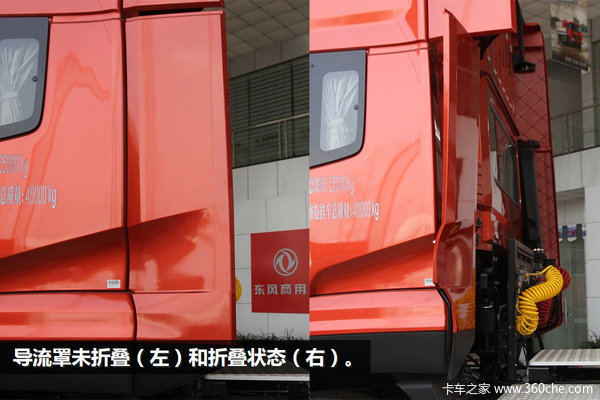 虽然装配了大马力发动机,但是其外观还是和其他的天龙一样,并没有什么大的变化,只是其驾驶室门上的马力标志显示这是一台装配了420马力发动机的天龙牵引车。该车改标配了导流罩,为方便驾驶员上下工作台,其驾驶室左侧的的导流罩可以大角度的移动。