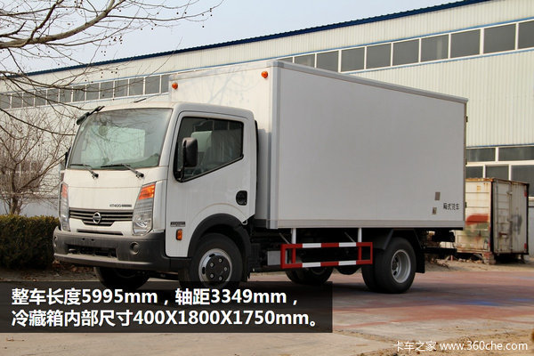 凯普斯达这款冷藏车整车长度5995mm,轴距3349mm,冷藏箱内部尺寸为4000x1800x1750mm。货厢侧面有单开门,方便装卸货。货厢前部,带有示高指示灯,这款车还未安装冷机。
