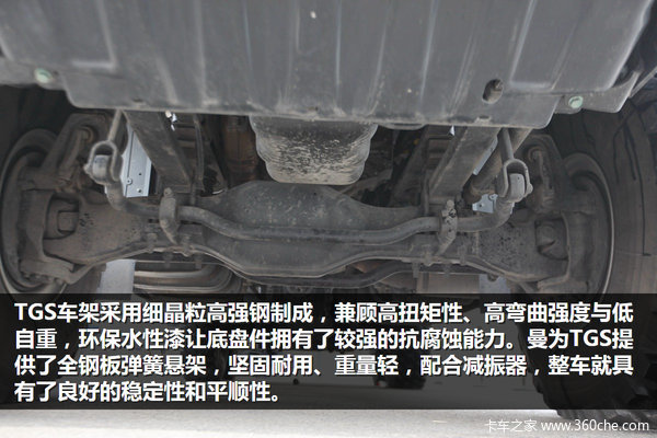 外形参观完了,我们来看看曼技术的底盘又有怎样的不俗表现。TGS车架采用细晶粒高强钢制成,兼顾高扭矩性、高弯曲强度与低自重,不易变形且便于改装,环保水性漆让底盘件拥有了较强的抗腐蚀能力。TGS提供了整车的全钢板弹簧悬架,抛物线形的钢板弹簧具有坚固耐用、重量轻的特点,配合减振器,整车就具有了良好的稳定性和平顺性,对于任何用途来说这些都是极佳的特性。