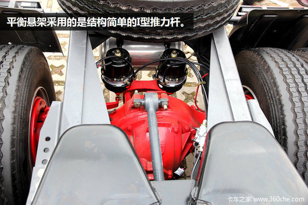 该车轮胎采用的是成山12R22.5型16层级轮胎,前桥采用A1H型前桥,前悬架采用四片抛物线弹簧。后桥采用速比为4.11的山东蓬翔457桥,后悬架同样采用了四片抛物线弹簧。